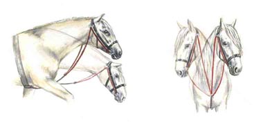 - Longe en colbert : Une autre méthode est un système très efficace qui permet au dresseur d’agir avec beaucoup de légèreté. On fait passer la longe dans l’anneau intérieur du filet, ensuite sur la nuque et l’extrémité de la longe est fixée à l’anneau extérieur du filet. L'action se fait sur la commissure des lèvres et ne blesse pas les barres, le cheval qui connait les flexions de Baucher cèdera à l'extension d'encolure quasi immédiatement.